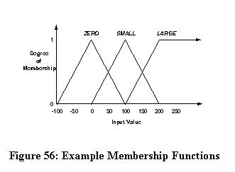 To compare these two techniques, consider a very simple mapping with one input and one output. Figure 56 defines the sets to be used in this example. The first function in this example uses two rules with fuzzy output sets: