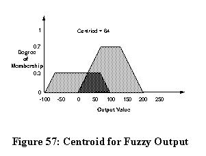 Suppose one wishes to calculate the output value of Function A for an input of value of 70. The first rule will have a weight of 0.3 and the second will have a weight of 0.7. Figure 57 shows the result of the weighting operations on the respective fuzzy output sets. The output of Function A is the centroid of the two shaded regions, which is calculated to be 64.