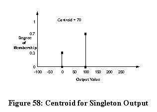 For Function B, the crisp centroid is much easier to calculate, as illustrated in Figure 58. For an input value of 70, its output is ((0.3)(0.0) + (0.7)(100.0))/(0.3 + 0.7) = 70. The singleton centroid scheme of Function B allows fuzzy rules to perform real-time control functions on ordinary processor hardware. This method of rule evaluation was used for the mobile robot MARGE as well as the camera control system described here.