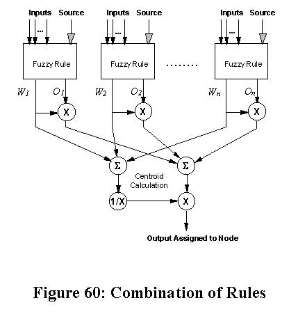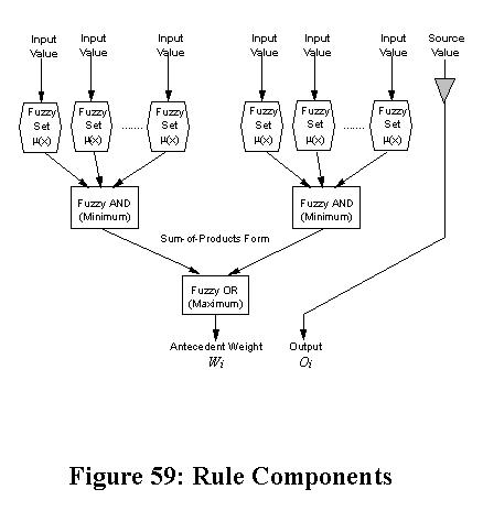 Figure 59 shows the block diagram of a fuzzy rule for the system. A rule performs a sum-of-products (intersection before union) operation on the fuzzy set comparisons in its antecedent using max-min or arithmetic sum and product operations. The resultant weight is assigned to the source value for the centroid calculation. Note that the source may be a fixed value, as is the case with most fuzzy control systems, or it may be a value passed from another operation. This allows a set of rules to act as a fuzzy multiplexer, by blending recommendations from other agents according to qualitative terms. Figure 60 shows the configuration of multiple rules for the evaluation of a fuzzy node. Notice that black arrowheads denote set inputs, while gray arrowheads denote sources for output recommendations.