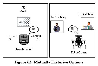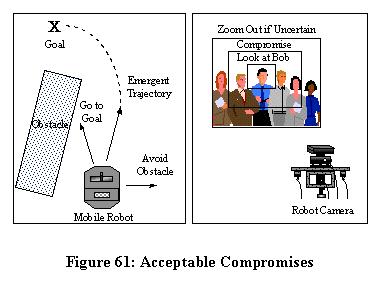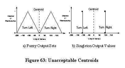 Centroid defuzzification works well for simple control systems that involve outputs with convex membership functions, e.g., servo controllers. It allows the system to compromise among multiple objectives, as shown in Figure 61. However, when the control system must choose between two exclusive output values, and a weighted-average compromise is unacceptable, centroid defuzzification will produce an undesirable control output. Figure 62 illustrates this problem faced by a mobile robot and a camera controller. For the mobile robot, the fuzzy control rules for steering recommend steering left or right as acceptable outputs, but not straight. For the camera controller, Figure 63(a) shows the output of the steer controller using fuzzy output sets, and Figure 63(b) shows the same for outputs defined with singleton values. Note that in either case, centroid defuzzification results in no net steering effect. The robot will therefore either crash into the object, or, if it is able to stop in time, may remain stuck in front of the object in a state of what could be termed "symmetric indecision."