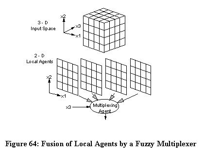 Rather than reducing the input space by non-fuzzy means, a system was developed to process a larger data space with multiple fuzzy agents. Consider a symmetric N-dimensional input space where each input dimension is to be spanned by the same number of fuzzy sets, M. If the fuzzy inference mapping is done in one step, the number of set evaluations that must be performed is N(M^N). If the input space dimensionality is broken down for processing by local agents, fewer set evaluations must be performed. Suppose one employs M^n local agents, where each will be assigned the same N - n inputs. These agents then may be fused by a fuzzy multiplexer that uses the n remaining inputs. The multiplexer will perform nM^n set evaluations, while each agent performs (N - n)(M^(N-n)). The total number set evaluations for this scheme is then N(M^N) n( M^N - M^n ) < N(M^N). A large input space can be broken down in several steps for considerable savings in computation. Figure 64 shows a 3-dimensional input space processed by local experts and fused by a multiplexer. Note that there is no restriction to using agents of uniform size or architecture; rather, the flexibility of using specialized agents of different types is an important part of this scheme. Each of the local agents, for instance, may be composed of additional agents in a hierarchical network.