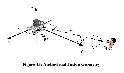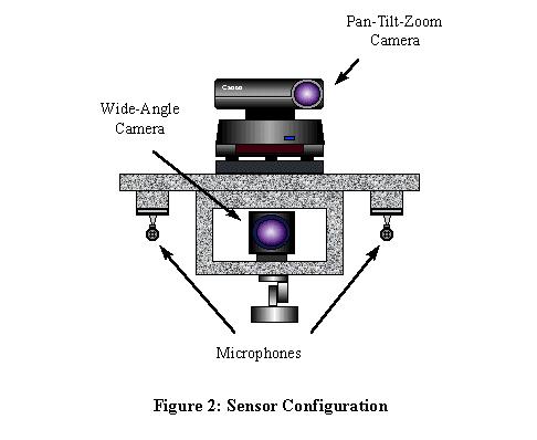 Sound localization and image pixel information both involve the angle at which target data arrives at the sensor. If one positions the cameras and microphones to share the same origin, then these sensors may use the same polar coordinate system. Figure 2 illustrates the placement of the wide-angle camera between the microphones. Naturally, both cameras may not be placed at the origin, so the pan-tilt-zoom camera is mounted about 15 cm above the wide-angle camera. Note also that the camera lens is horizontally offset about 3 cm from the center of the camera, and that the optical axis does not run through the pivot point. At close range, this less-than-ideal geometry adversely affects the accuracy of position measurements and movements, but for more distant targets, it may be ignored. Pixel-level fusion between two cameras, as performed in applications such as stereo vision, requires very precise alignment of optics. Sound localization data, however, is much lower resolution than the image data, requiring less precise alignment for fusion to take place and allowing a common origin to be assumed for each. It will also be assumed that the target's angle of elevation will be small enough that the estimation of sound azimuth will be approximately equal to the visually measured azimuth in polar coordinates.