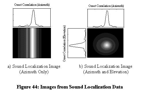 With only two microphones, onset correlation provides a 1-D function of sound power versus azimuth, since interaural delay and azimuth are related by Equation (1). Figure 44a shows this function mapped to a two-dimensional "sound image," where image brightness indicates the level of onset correlation. In this example, it has been assumed that elevation is small enough that each column of pixels relates directly to an interaural delay value. (The actual locus of points defined by a given interaural delay is a hyperbolic cone, but this is approximated as a vertical plane in Equation (1).) If two orthoganal pairs of microphones are used for onset correlation, then sound energy may also be related to elevation. Figure 44b shows how onset correlation plots for azimuth and elevation may be combined to create a 2-D image of sound power. In this illustration, correlation values for elevation and azimuth are multiplied together to form each pixel in the sound image, thus highlighting the area where sound power from each direction intersects. (Onset correlation values from two pairs of microphones are statistically independent between azimuth and elevation. This means that the probability that a sound originates at a given azimuth and elevation may be calculated from the product of the individual azimuth and elevation probabilities for the two onset correlation plots. Multiplication of the raw correlation values between the independent measurements is not exacly the same as multiplying their probability densities conditional on the presense of a sound target, but is close enough for illustration purposes intended in Figure 44.) Only one pair of microphones was available for real-time processing for the implementation done in this research, so only the 1-D sound image is used in the remainder of this dissertation.