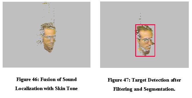This chapter has demonstrated how audio and visual information may be combined during the classification of pixels. After segmentation and region growing, the next task is to determine which of the remaining regions is a face. One may use size, bounding box aspect ratio, region moments, or other classifiers to make this determination. A person's arm, for example, may appear in the image and take up as much image area as the face. Region moments and bounding box information can be used to dismiss such a region. Ideally, background objects above and below the face will not be skin-colored, simplifying the region selection task. Otherwise, a more sophisticated face detector might be used, such as one based on pattern analysis, or complementary information such as that from an orthogonal microphone pair will be required. For this dissertation project, however, simply choosing the largest segmented region (e.g., the box in Figure 47) was a surprisingly effective means of finding the speaker's face for the requirements of camera control.