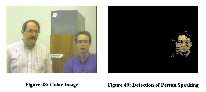Figure 46 shows the detection of face pixels using both sound and skin tone. Note how many skin-colored background pixels such as those detected in Figure 41 have been eliminated in Figure 46. In this way, sound information is used to simplify the visual task and improve performance. Figure 47 shows a similar frame after 3 x 3 filtering and region-growing to reduce noise and delineate the face region. Figure 48 shows two people within the camera's view, with the person on the right speaking. Figure 49 shows the detected skin-colored face pixels that correspond to the direction of sound. This method allows non-speaking faces to be eliminated from consideration without detecting and processing the regions they occupy.