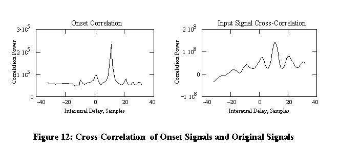 Figure 12 shows the results of performing cross-correlation on the left and right onset signals as compared to the results of using the original sampled sound signals. The peak of both cross-correlations occurs at an interaural delay of 11 samples. If we assume the speed of sound to be 344 m/s given the conditions in the room, a sampling period of 1/44100, and a microphone spacing of 0.3 m, Equation (1) may be used to calculate the angle to the speaker as sin(1(344(11/44100)/0.30) = 16.6 degrees.