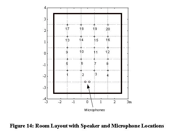 The seven-by-five meter videoconferencing room selected for acoustics experiments was modeled in simulation to predict the performance of the real system. In the simulation, two microphones were located at one end of the room, with sound being emitted from one of twenty different possible sound origin (speaker) locations. The room geometry and sound origin locations are shown in Figure 14. The coordinate system origin was placed at the center of the room for convenience in calculating echo paths.
