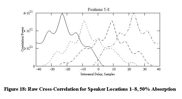 The plot in Figure 16 depicts the effects for walls and ceiling materials which absorb 50% of the sound pressure level of waves striking them. Real-world building materials vary in absorption, so nine different absorption values (0.1, 0.2, 0.3, ..., 0.9) were simulated. The words "Testing one, two, three" were recorded from a microphone at 44 kHz, 16 bits/sample and used for the source sound. Figure 17 shows the results of performing the onset correlation algorithm on the resulting sounds for speaker positions 5 through 8, with 50% absorption used for the walls, ceiling, and floor. Figure 18 shows the raw cross-correlation results for the same data. Plots from simulations of all the absorption coefficients and all 20 positions are provided in Appendix A. Significant localization errors did not occur for either localization method until wall absorption was lowered to 0.1, and this only occurred for the furthest row of speaker locations (17 through 20).