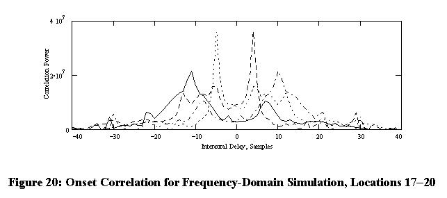In real life, building materials do not reflect all frequencies uniformly as was assumed in the previously described simulation. The frequency-dependent absorption characteristics of typical ceiling and carpeting materials are shown in Figure 19, as adapted from data given by Everest [104]. To simulate these effects on the echo signals, a frequency-domain simulation was necessary. The original sound was multiplied by a Hanning window and the Fourier transform was taken. The frequency-domain transfer function of the room was constructed by summing up the individual frequency components from each echo path. The reflectance value for each reflecting surface was multiplied by the others along the path on a per-frequency basis, and the phase values were calculated from the time delay. The resulting room transfer function was then multiplied by the Fourier transform of the speech signal, and the inverse transform was calculated so the time-domain onset correlation algorithm could be applied. The results of this simulation for locations 17-20 are shown in Figures 20 and 21. No significant localization errors were detected for the room locations considered in this simulation. Note in Figure 21 how wide the raw cross-correlation peak has become, although the maximum value is still in the correct place.