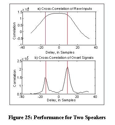 If speakers are not expected to move very quickly, then sound delay histograms may be integrated over longer periods of time to increase stability and reject noise. In videoconferencing and other social situations, multiple speakers in the room may talk back and forth or talk simultaneously. It is therefore important for the sound localization system to correctly detect these sound sources as separate speaker locations. Figure 25 compares the delay detectors for a ten-second recording of two people quickly speaking back and forth. The onset correlation algorithm clearly shows two distinct peaks corresponding to the speaker locations. The correlation of raw inputs, however, blurs together the wide peaks characteristic of this method, and the single resulting peak occurs between the speaker positions.