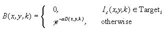 where Iref is the reference image (including all three RGB components), Ic is the current image captured from the camera, and B is an array containing a separate gain value for each pixel. The elements of B range from zero to one (although a limit less than one may be used) and serve as a mask for updating the reference image. One may obtain B by looking for motion in the most recent images, and integrating it into a motion history image, D. If there is recent motion in part of the image, or if it is believed that part may be occupied by a human target, then corresponding pixels of B will be zero; for example: