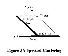 Thus the surface orientation of the object affects the intensity of the surface and body reflections, but not their spectra. The observed color is the sum of scaled versions of the surface reflection and body reflection vectors, as illustrated in Figure 37. The color measured from an object such as a sphere will be clustered along two lines: the matte line, where body reflection grows up from the shadows, and the highlight line, where surface reflection adds to the body reflection and produces a shine effect.